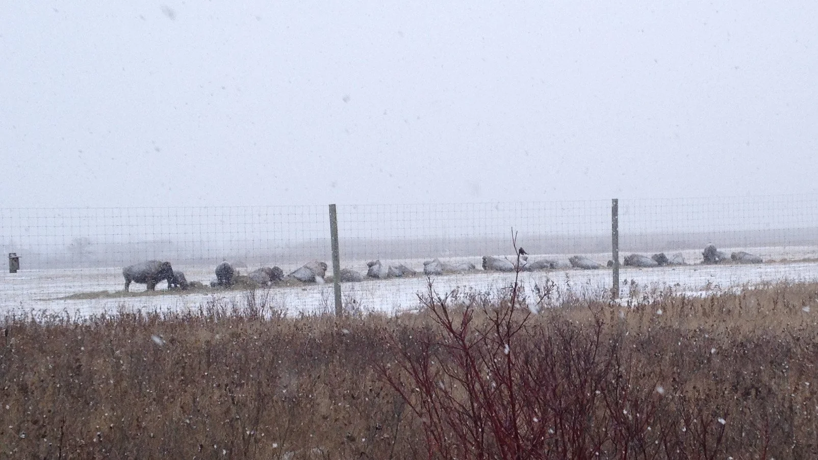 FortWhyte’s Bison Herd hunkering down during a snowfall.