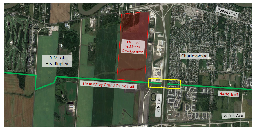 Headingley Grant Trunk Trail Association (HGTTA) and Friends of the Harte Trail (FoHT) worked jointly on a project they received funding for by Infrastructure Canada - the Active Transportation Fund. To lay the groundwork for an active transportation (AT) crossing at PTH 100 (the perimeter highway) between the HGTT and HT (yellow box below).